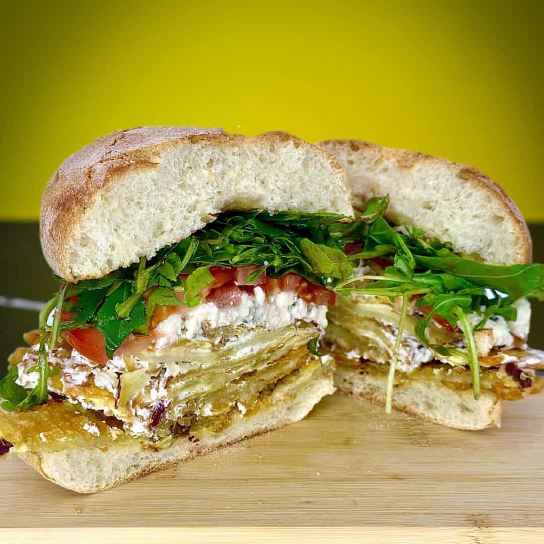 The Late Nighter starts with sweet potato fries tossed in a creamy goat cheese and topped with a sprinkle of blue cheese crumbles for a little extra bite. Then we add arugula tossed in a fresh raspberry vinaigrette, a few juicy tomatoes, and a smear of Dijon mustard, all layered onto a ciabatta roll. It’s a mix of sweet, tangy, and savory flavors that came together on a whim but turned into a signature treat. It’s perfect for those late-night cravings or whenever you want a sandwich that’s a little out of the ordinary.